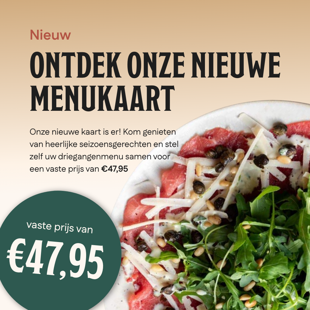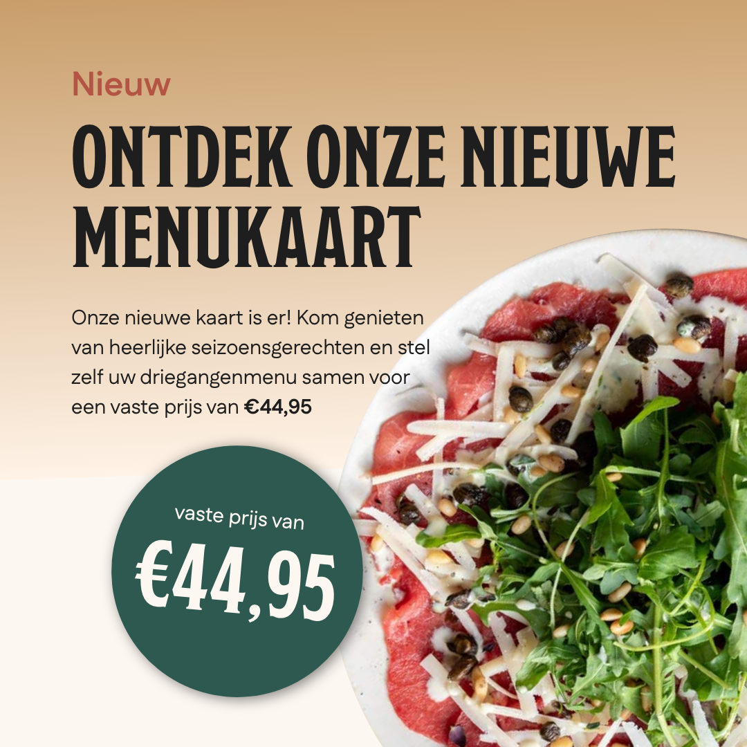Kies uw favoriete gerechten en geniet van een driegangenmenu voor een vaste prijs van €44,95. Onze chef heeft een selectie van seizoensgerechten samengesteld waaruit u zelf uw ideale combinatie kunt maken. Zo bepaalt u wat er op tafel komt, terwijl de prijs alvast vaststaat.